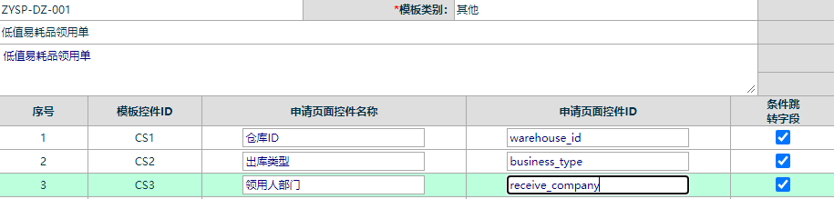 進入基礎資料維護-模板設計,三個條件選一個,名稱改成領用人部門,控件ID改成receive_company。