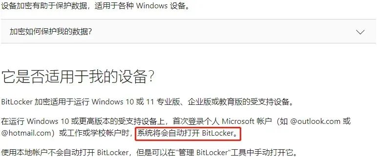 此前還僅是針對的 Windows 10、11 專業(yè)版極以上版本,在用戶首次登錄 Microsoft 賬戶或工作學習賬戶時,系統(tǒng)將自動開啟 BitLocker 加密。