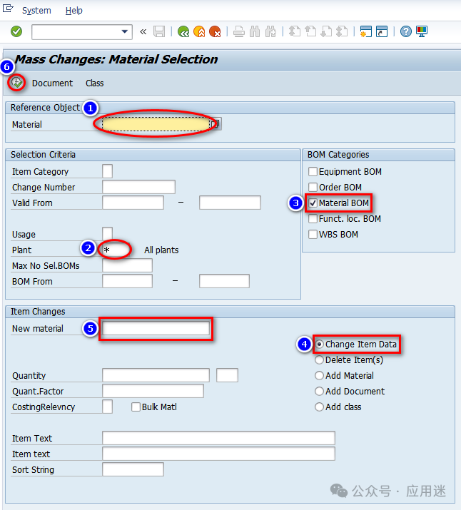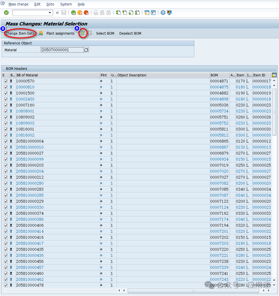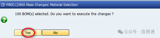 一個(gè)工廠或者多個(gè)工廠的所有包含A組件物料的BOM需要將組件物料A批量替換成B,請(qǐng)問(wèn)如何處理?使用cs20事務(wù)碼即可。在SAP起始頁(yè)按下ctrl + /快捷鍵定位到事務(wù)碼運(yùn)行框,輸入cs20,按下回車鍵。輸入舊的組件物料編碼(見(jiàn)①),輸入工廠編碼(見(jiàn)②),輸入星號(hào)代指所有工廠,選擇BOM類型(見(jiàn)③),選擇具體操作(見(jiàn)④,一定是選擇Change Item Data),輸入替換后的新組件物料編碼(見(jiàn)⑤),點(diǎn)擊運(yùn)行(見(jiàn)⑥,快捷鍵F8)。全選查找出來(lái)的BOM(見(jiàn)?,快捷鍵Ctrl+F5),點(diǎn)擊Change Item Data(見(jiàn)?,快捷鍵是F8)。下圖顯示的BOM奇數(shù)行和偶數(shù)行顏色不一樣,讓行與行之間容易區(qū)分,設(shè)計(jì)比較貼心。提示已經(jīng)選中了多少BOM,是否修改,點(diǎn)擊Yes。窗口底部狀態(tài)欄提示