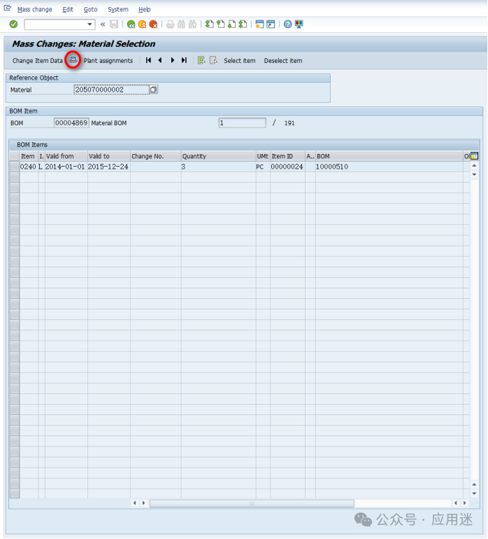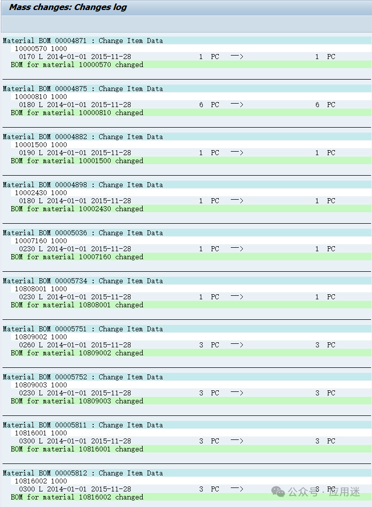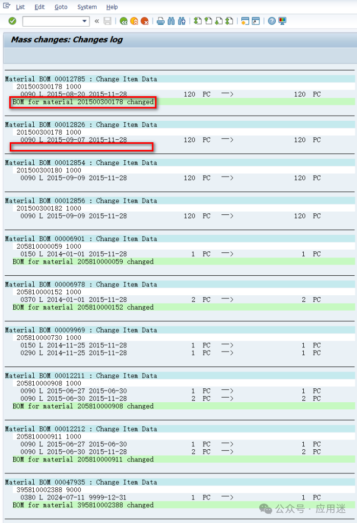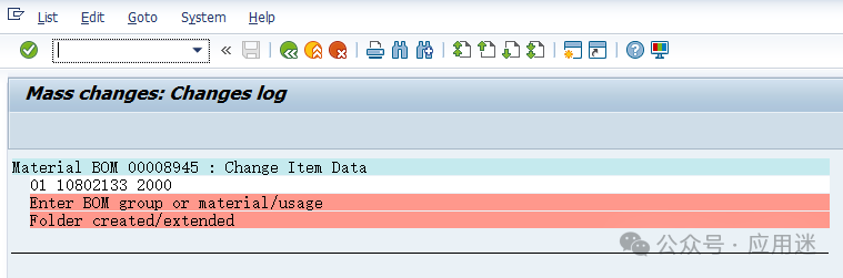 如果顯示下圖界面,就需要點(diǎn)擊上面的帽子圖標(biāo),然后全選BOM,點(diǎn)擊Change Item Data。為什么會(huì)顯示下圖界面,而不是顯示所有查找到的BOM?歡迎屏幕前的你留言討論。批量替換完畢后會(huì)顯示如下日志,有些會(huì)顯示BOM for material XXXXXXXXXXXX changed,有些顯示為空,大家知道是為什么嗎?可以在文章下方留言討論,期待大家的回音。 批量更改失敗的會(huì)碰到下面這種情況,說(shuō)明BOM group或者material/usage不存在,無(wú)法替換。