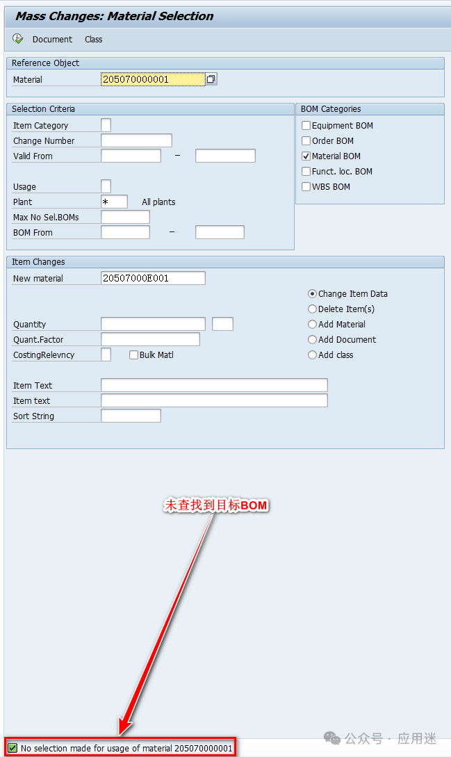 當(dāng)然也有些特殊情況,比如如下圖提示No selection made for usage of material 205070000001,說(shuō)明沒(méi)有需要替換的BOM,可以繼續(xù)下一個(gè)替換了。