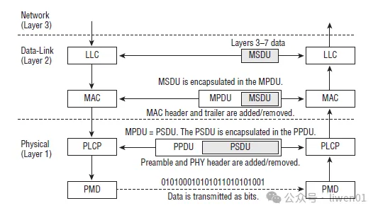上面這個(gè)模型其實(shí)是非常概括性的,實(shí)際要復(fù)雜很多,從這個(gè)圖上我們看不出以太網(wǎng)與無線網(wǎng)有什么差別。 以太網(wǎng)與無線網(wǎng)在 OSI 模型上主要的差異在于第一和第二層,也就是物理層和數(shù)據(jù)鏈路層。 (1) 物理層(Physical Layer)物理層主要負(fù)責(zé)在網(wǎng)絡(luò)設(shè)備之間傳輸原始的比特流(0和1)。它涉及物理連接,如電纜、光纖和無線電波,以及數(shù)據(jù)傳輸?shù)碾姎夂蜋C(jī)械特性。常見的物理層設(shè)備包括網(wǎng)卡、集線器和電纜。 以太網(wǎng):以太網(wǎng)使用有線連接,如雙絞線電纜或光纖來傳輸數(shù)據(jù)。物理層定義了傳輸?shù)碾娦盘?hào)、電壓和脈沖等特性。 無線網(wǎng)(Wi-Fi):Wi-Fi通過無線電波在空氣中傳輸數(shù)據(jù)。物理層涉及無線頻率的選擇、天線的配置,以及信號(hào)的調(diào)制和解調(diào)方式 (2) 數(shù)據(jù)鏈路層(Data Link Layer)數(shù)據(jù)鏈路層負(fù)責(zé)在相鄰節(jié)點(diǎn)之間建立可靠的通信鏈路。它將數(shù)據(jù)幀從一個(gè)節(jié)點(diǎn)發(fā)送到下一個(gè)節(jié)點(diǎn),并處理幀的傳輸錯(cuò)誤。數(shù)據(jù)鏈路層還包括 MAC (介質(zhì)訪問控制)子層和 LLC (邏輯鏈路控制)子層。常見的設(shè)備有交換機(jī)和網(wǎng)橋。 以太網(wǎng):在數(shù)據(jù)鏈路層,以太網(wǎng)通常使用以太網(wǎng)幀(Ethernet Frame)進(jìn)行數(shù)據(jù)封裝。MAC 地址用于標(biāo)識(shí)網(wǎng)絡(luò)設(shè)備,并控制對(duì)介質(zhì)的訪問(CSMA/CD,載波偵聽多路訪問/沖突檢測(cè)機(jī)制)。 無線網(wǎng)(Wi-Fi): 無線網(wǎng)在數(shù)據(jù)鏈路層也使用幀進(jìn)行數(shù)據(jù)封裝,但 Wi-Fi 幀格式與以太網(wǎng)幀有所不同。Wi-Fi使用 CSMA/CA (載波偵聽多路訪問/沖突避免機(jī)制)來管理介質(zhì)訪問,并增加了加密(如 WPA/WPA2 )和認(rèn)證(如802.1X)的功能,以增強(qiáng)安全性。 (3) 無線網(wǎng)數(shù)據(jù)幀封裝對(duì)無線網(wǎng)的物理層和數(shù)據(jù)鏈路層再進(jìn)一步劃分,我們可以看到物理層有:PLCP 和 PMD 層,數(shù)據(jù)鏈路層有:MAC 層和 LLC層