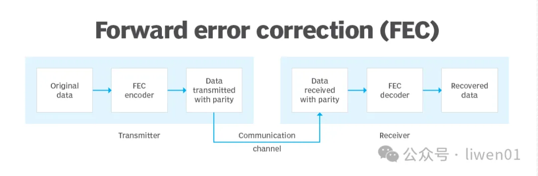 數(shù)據(jù)子載波數(shù) x 每個(gè)符號(hào)傳輸比特?cái)?shù) x 載波編碼率 x 符號(hào)速率 = 最大理論速率 52 * 6bit * 3/4 * 250 ksps = 58.5Mbps 數(shù)據(jù)子載波數(shù)量增加了 4 個(gè),所以速率由 802.11g 的 54Mbps 提升到了 58.5Mbps。 (2) 802.11n 的 FEC前向糾錯(cuò)編碼 (Forward Error Correction,F(xiàn)EC) 技術(shù)在發(fā)送端將原始數(shù)據(jù)塊進(jìn)行編碼,添加冗余信息形成編碼數(shù)據(jù)塊。接收端通過解析這些冗余信息來檢測(cè)和糾正傳輸過程中出現(xiàn)的錯(cuò)誤。 這種方法不需要反饋和重傳,因此可以顯著提高數(shù)據(jù)傳輸?shù)男?,特別是在高噪聲或信號(hào)衰減嚴(yán)重的無線環(huán)境中。