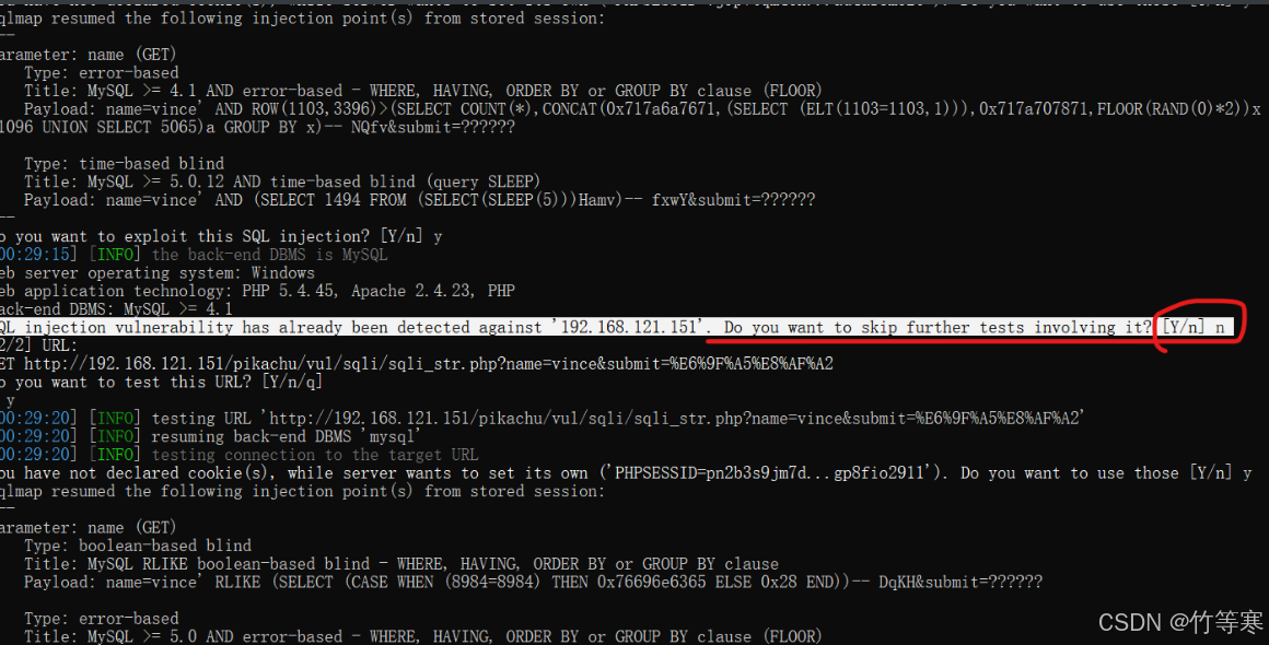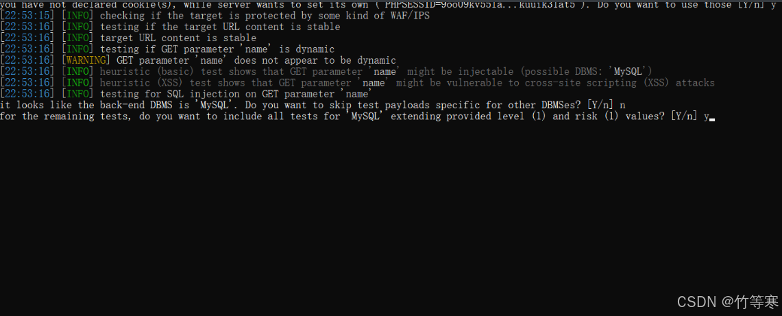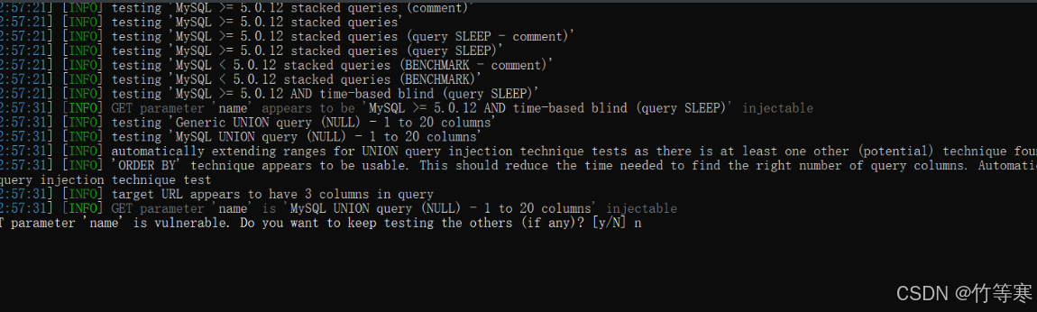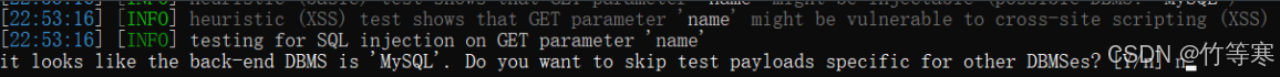 1:sqlmap測試出來時哪個數(shù)據(jù)庫的時候會提示你是否還繼續(xù)測試其他數(shù)據(jù)庫的payload注入語句,這里一般輸入n,你不放心就可以y
