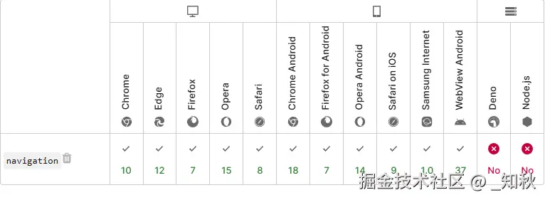 performance.navigation API 在大多數(shù)瀏覽器中都被支持,但該 API 已逐步被棄用: