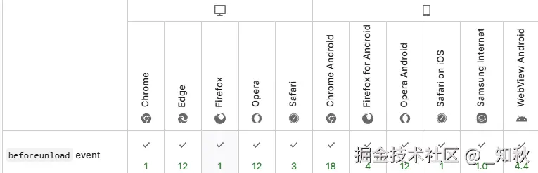 beforeunload | 靈活,可處理多種離開(kāi)頁(yè)面的操作 | 部分瀏覽器不支持,尤其是在移動(dòng)端 | 大多數(shù)現(xiàn)代瀏覽器支持 |