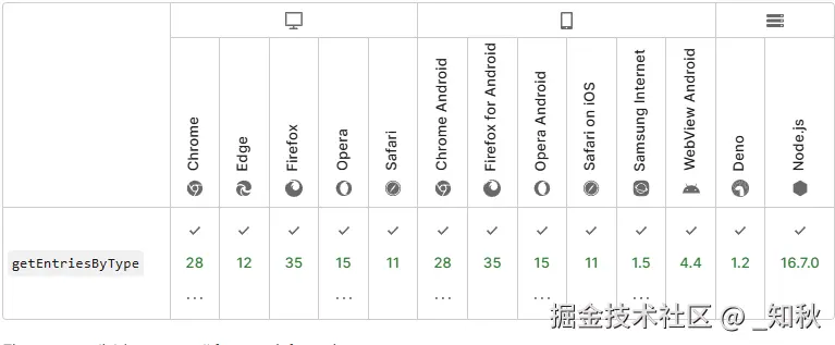 performance.getEntriesByType 是較新的 API,在現(xiàn)代瀏覽器中得到廣泛支持,但較舊瀏覽器不支持: