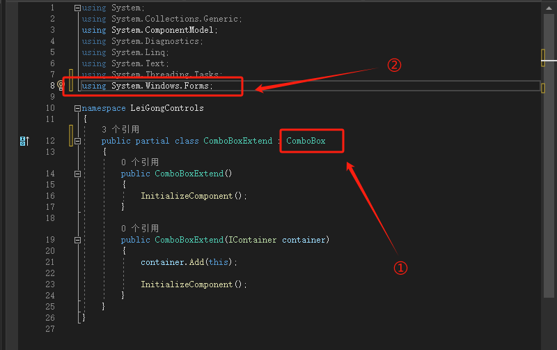 然后修改其繼承自ComboBox,然后添加引用關(guān)系,引用并在命名空間添加上: