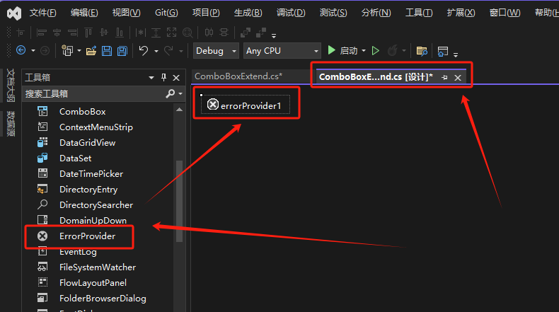 2.3、添加控件 在工具箱中找到ErrorProvider,拖動(dòng)到設(shè)計(jì)視圖。