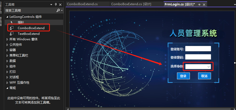 在之前的界面中添加一項(xiàng)【選擇身份】,用來選擇是管理員登錄還是普通用戶登錄。 如圖將擴(kuò)展的控件ComboBoxExtend拖到界面中合適的位置。 2.6、登錄按鈕 在登陸按鈕的事件代碼中添加上該項(xiàng)的檢查 代碼如下: