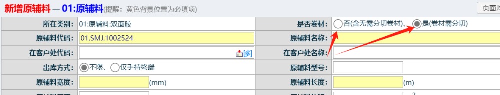 :點(diǎn)晴ERP-物料信息卷料屬性的說明![]() 新增原材料信息時(shí),有個(gè)是否卷材的屬性。 只有卷材屬性的物料才要寬長這兩個(gè)信息。