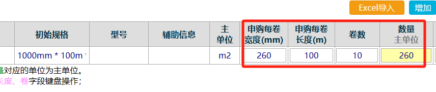 舉個(gè)例子: 在新增申購單時(shí),如果這個(gè)是個(gè)卷材,填寫申購信息時(shí)就要把寬長卷填上 如果是卷材時(shí)填上寬長卷后數(shù)量會(huì)自動(dòng)出來,此時(shí)數(shù)量為平方數(shù) 如下圖: ![]() 如果是非卷材時(shí),不需要填寬長卷,直接填寫數(shù)量,此數(shù)量就是個(gè)單一計(jì)量單位 如下圖: ![]() 點(diǎn)晴模切ERP更多信息:http://moqie.clicksun.cn,聯(lián)系電話:4001861886 該文章在 2024/10/25 9:08:38 編輯過 |