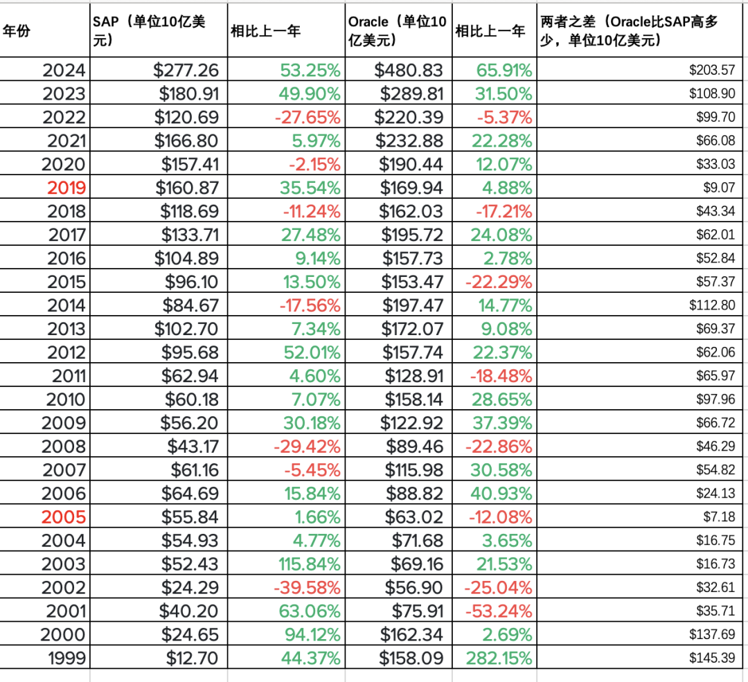 兩者的收購策略Oracle的收購策略Oracle的策略更側(cè)重于大規(guī)模收購、市場壟斷與技術(shù)補(bǔ)充。 其主要目標(biāo)是通過收購云服務(wù)、數(shù)據(jù)庫和應(yīng)用軟件公司來增強(qiáng)其云計(jì)算和數(shù)據(jù)庫技術(shù)能力。 最具代表性的收購是2009年以74億美元收購Sun Microsystems,以及后來的NetSuite和PeopleSoft。 這些收購幫助Oracle擴(kuò)展了其云應(yīng)用產(chǎn)品,并大大增強(qiáng)了其企業(yè)軟件市場的份額。 SAP的收購策略SAP則更注重收購能夠補(bǔ)充其核心業(yè)務(wù)的公司,特別是在云計(jì)算、人工智能、大數(shù)據(jù)等領(lǐng)域。其重要收購包括2012年以43億美元收購Ariba(全球領(lǐng)先的采購網(wǎng)絡(luò)平臺),以及SuccessFactors ,快速布局云市場。 這些收購旨在增強(qiáng)SAP的云端服務(wù)能力,并將其ERP系統(tǒng)與新興技術(shù)整合,為客戶提供更全面的數(shù)字化轉(zhuǎn)型解決方案。 收購收益和比較Oracle收益:Oracle通過收購大規(guī)模鞏固了其數(shù)據(jù)庫和云服務(wù)市場地位,尤其是NetSuite的收購讓其在中小企業(yè)市場獲得了強(qiáng)勢優(yōu)勢。盡管一些收購整合較為復(fù)雜,Oracle通過其全棧云服務(wù)平臺取得了顯著收益。 SAP收益:SAP的收購幫助其快速進(jìn)入云端市場。SAP的戰(zhàn)略被視為使其在云計(jì)算領(lǐng)域獲得了一定的領(lǐng)先優(yōu)勢,但在云基礎(chǔ)設(shè)施領(lǐng)域并未直接挑戰(zhàn)Oracle或其他大型云平臺。 兩者市值漸行漸遠(yuǎn)關(guān)于市值,兩者最接近的年份一般認(rèn)為是2005以及2019年左右。那時(shí),SAP的市值接近Oracle,主要由于互聯(lián)網(wǎng)泡沫的影響和兩家公司在企業(yè)軟件市場的快速增長。 SAP:2772億美元,Oracle 4808億美元。 2000年 然而,隨著時(shí)間推移,SAP與Oracle之間的市值差距逐漸擴(kuò)大,主要原因包括: 1. 市場定位:Oracle將重心逐漸轉(zhuǎn)向云計(jì)算和數(shù)據(jù)庫,而SAP則在ERP和企業(yè)云解決方案方面投入更多。雖然SAP在云業(yè)務(wù)上取得了一定進(jìn)展,但Oracle在云基礎(chǔ)設(shè)施和平臺服務(wù)方面的增長速度更快。 2.收購策略:Oracle通過收購多家公司(如Sun Microsystems和NetSuite)快速擴(kuò)展其云和硬件產(chǎn)品線,而SAP在收購方面相對保守。 3.客戶轉(zhuǎn)型:許多企業(yè)在向云轉(zhuǎn)型時(shí)選擇了Oracle的云服務(wù),這對SAP造成了壓力。 對于其他云廠商的啟示包括:
