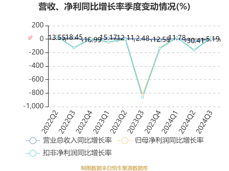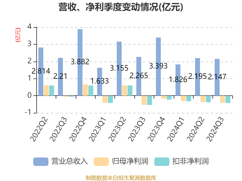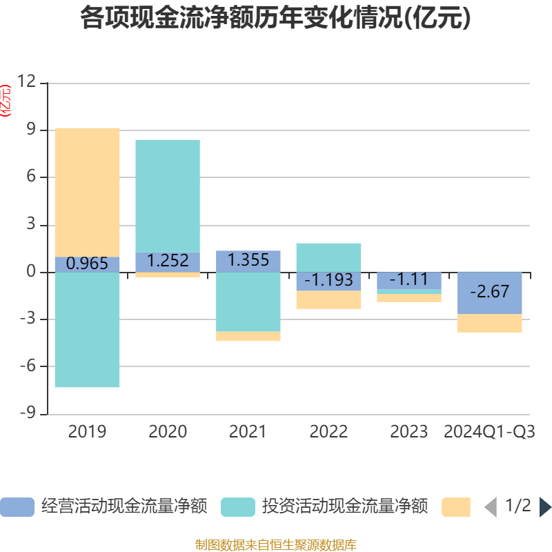 2024年前三季度,公司經營活動現金流凈額為-2.67億元,同比增加3105.79萬元;籌資活動現金流凈額-1.17億元,同比減少8213.42萬元;投資活動現金流凈額264.44萬元,上年同期為-2417.36萬元。