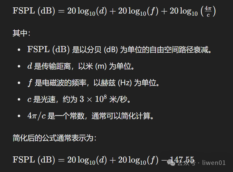 自由空間衰減不考慮任何障礙物、反射、折射或散射等因素的影響,僅僅是由于波前的擴(kuò)散而導(dǎo)致的信號(hào)強(qiáng)度減弱。 它的計(jì)算公式是: