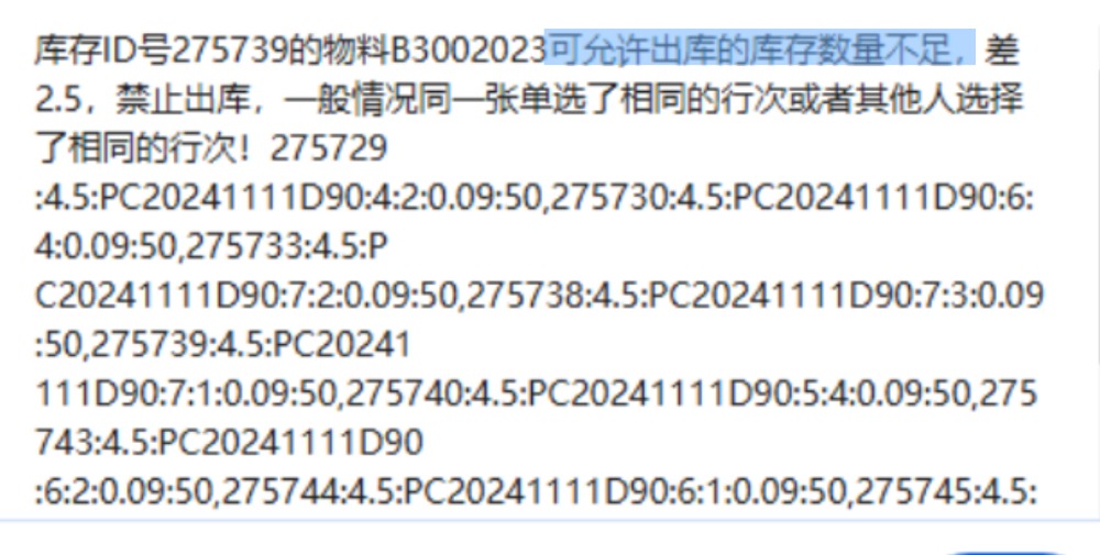 情況描述:?彈出提示:可允許出庫的庫存數(shù)量不足,禁止出庫,一般情況同一張單選了相同的行次或者其他人選擇了相同的行次! 如下圖: