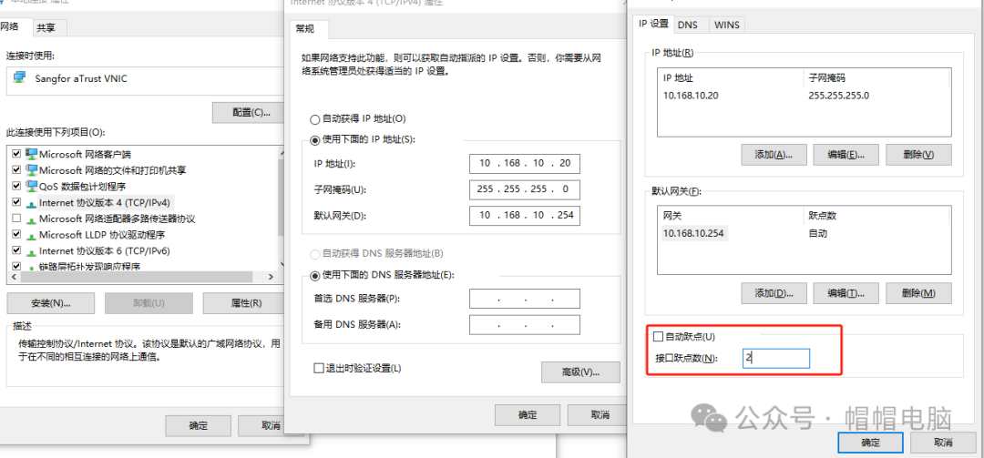 例如我下面,方法和無線的是一樣的,唯一的區(qū)別是有線因?yàn)檫B接的是內(nèi)網(wǎng),會有靜態(tài)IP設(shè)置,這里沒關(guān)系,進(jìn)入高級里面設(shè)置一下跳躍點(diǎn)比無線的數(shù)值大即可,記得設(shè)置好了依次點(diǎn)擊確定退出來,沒有點(diǎn)確定是不生效,很多新手在設(shè)置的時(shí)候明明操作是對的,就因?yàn)檫@個(gè)不成功。