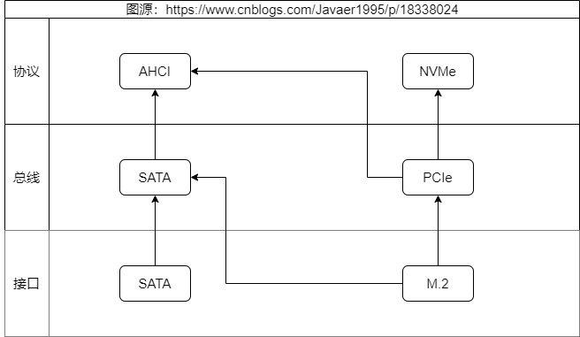 如上圖所示,SATA 接口的硬盤,只能使用 SATA 總線和 AHCI 協(xié)議。 M.2 接口的硬盤,既可以使用 SATA 總線和 AHCI 協(xié)議,也可以使用 PCIe 總線和 AHCI 協(xié)議,還可以使用 PCIe 總線和 NVMe 協(xié)議。