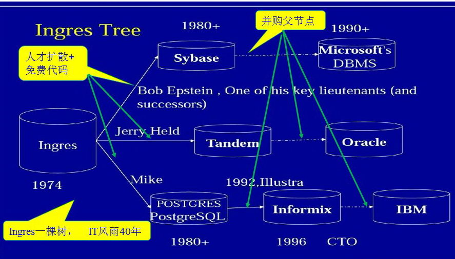 邁克爾.斯通布雷克可不是普通大佬,應(yīng)該是巨佬,數(shù)據(jù)庫領(lǐng)域只有4個人獲得了圖靈獎。 (1)查爾斯 ? 巴赫曼 數(shù)據(jù)庫領(lǐng)域的開拓者,網(wǎng)狀數(shù)據(jù)庫的發(fā)明人,2017年去世 (2)埃德加 ? 科德 關(guān)系數(shù)據(jù)庫的發(fā)明人,2003年去世 (3)詹姆斯 ? 格雷 事務(wù)處理技術(shù)的奠基人,2007年出海后失蹤,2012年被宣布死亡 (4)邁克爾·斯通布雷克 沒錯,邁克爾.斯通布雷克是唯一還在世的數(shù)據(jù)庫巨佬。 邁克爾·斯通布雷克有多牛,看看下面兩幅圖就明白了。 首先他帶頭開發(fā)了Ingres,成為很多數(shù)據(jù)庫的老祖宗:
