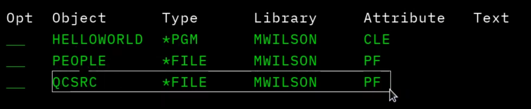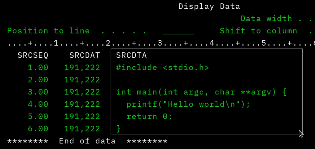 QCSRC就是個一個表,這個表有三列:SRCSEQ,SCRDAT,SRCDTA。 其中SRCDTA中保存著HelloWorld的源代碼,一共六行。