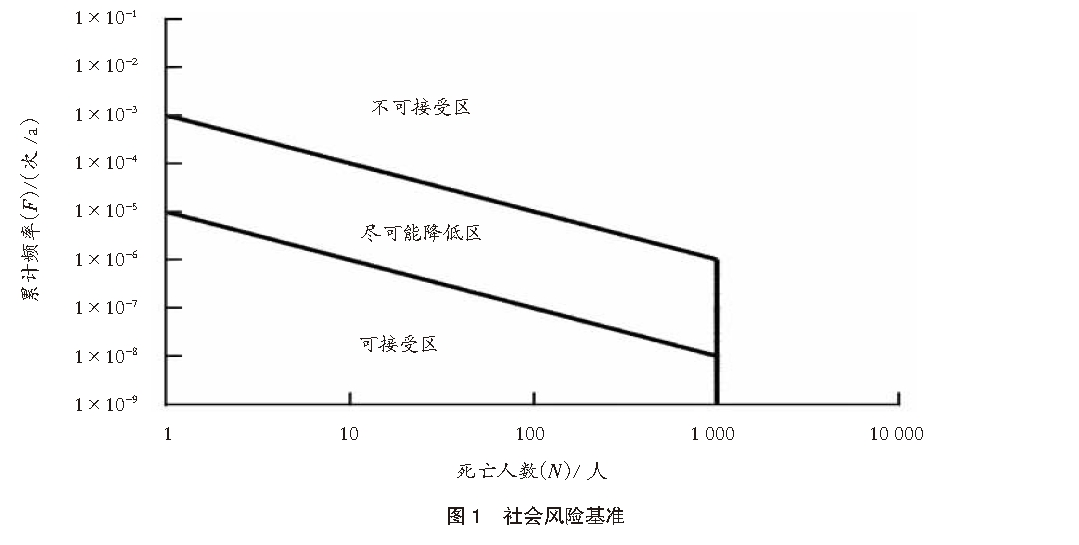 式中:R為網(wǎng)格點(diǎn)處的個(gè)人風(fēng)險(xiǎn);fS為泄漏場景發(fā)生頻率;PM為天氣概率;Pφ為風(fēng)向概率;Pi為點(diǎn)火概率;P個(gè)體風(fēng)險(xiǎn)為網(wǎng)格點(diǎn)的死亡概率。個(gè)人風(fēng)險(xiǎn)通常以個(gè)人風(fēng)險(xiǎn)等值線表示,將相同個(gè)人風(fēng)險(xiǎn)的網(wǎng)格點(diǎn)相連繪制成個(gè)人風(fēng)險(xiǎn)等值線,與表1中的個(gè)人風(fēng)險(xiǎn)基準(zhǔn)進(jìn)行比對,得出個(gè)人風(fēng)險(xiǎn)是否可接受的結(jié)論。2.3 社會風(fēng)險(xiǎn)計(jì)算模型在計(jì)算社會風(fēng)險(xiǎn)時(shí),在個(gè)人風(fēng)險(xiǎn)計(jì)算確定的各泄漏場景、天氣等級(M)、風(fēng)向(φ)、點(diǎn)火事件(i)的基礎(chǔ)上,確定網(wǎng)格點(diǎn)內(nèi)的人數(shù)Ncell,得到對應(yīng)的網(wǎng)格點(diǎn)的人口死亡百分比(P社會風(fēng)險(xiǎn))。計(jì)算死亡總?cè)藬?shù)(∑所有網(wǎng)格單元P社會風(fēng)險(xiǎn)×Ncell)≥N的所有事故發(fā)生的頻率(FN),并進(jìn)一步構(gòu)造社會風(fēng)險(xiǎn)F-N曲線,根據(jù)F-N曲線所處區(qū)域,與圖2社會風(fēng)險(xiǎn)基準(zhǔn)進(jìn)行比對,得出社會風(fēng)險(xiǎn)是否可接受的結(jié)論。社會風(fēng)險(xiǎn)計(jì)算公式為