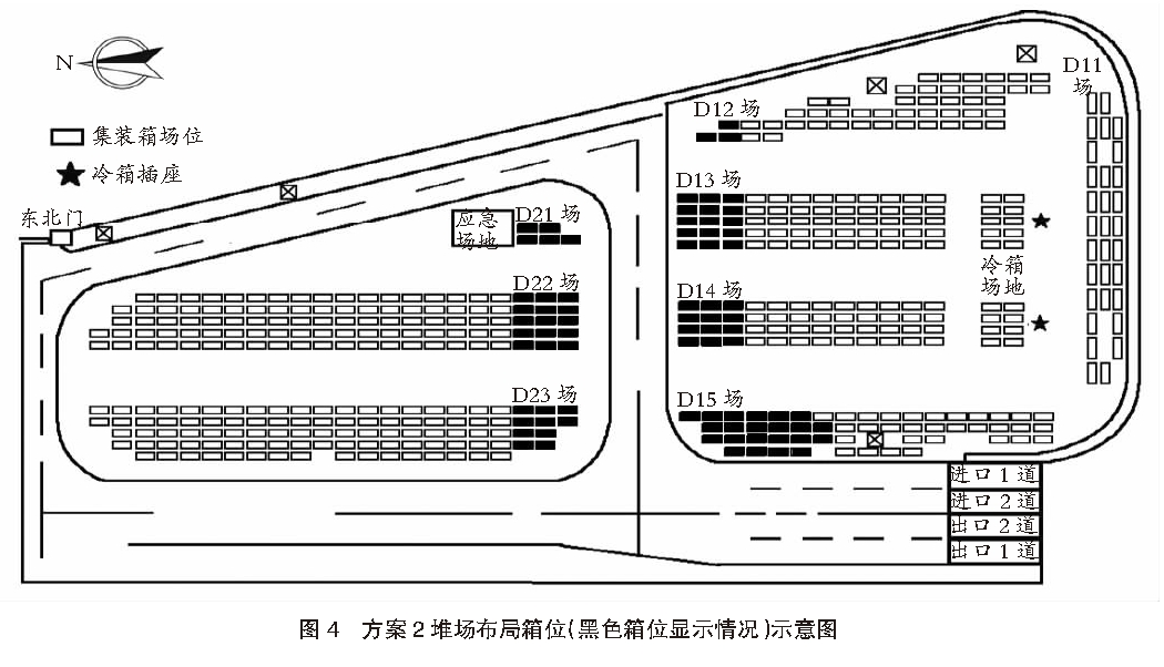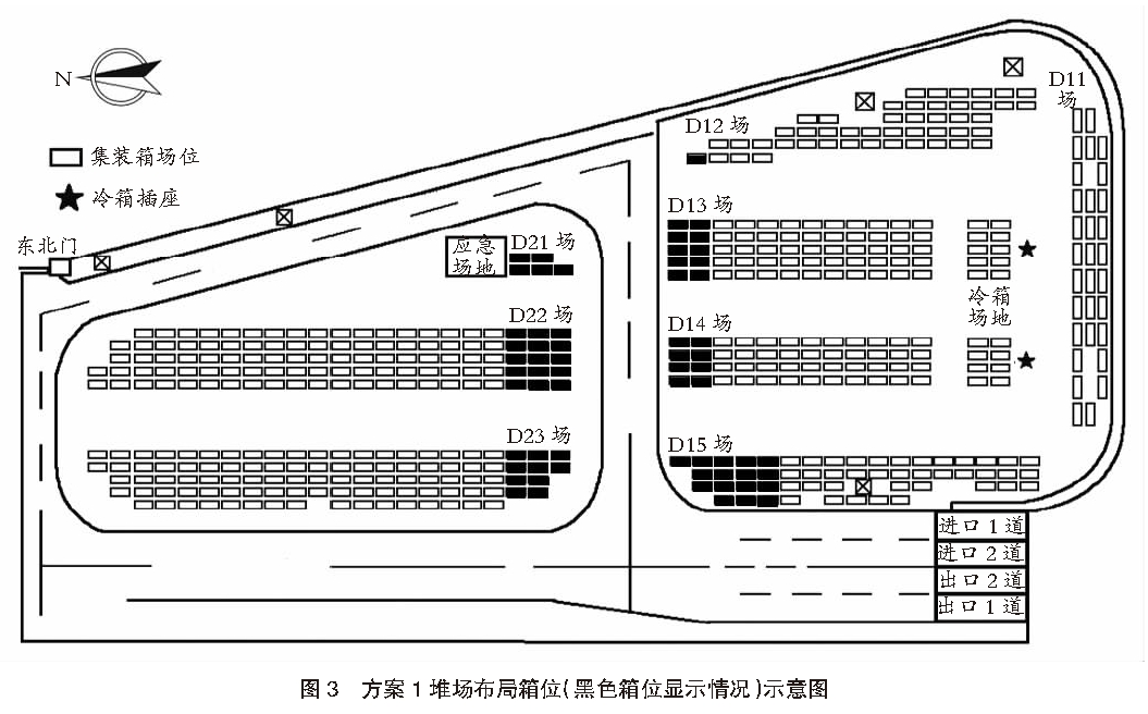 - 方案1:-48 ℃≤閃點(diǎn)<-18 ℃,總箱量不大于130 TEU。儲存區(qū)域?yàn)椋篋11不堆存;D12堆存2 TEU(北側(cè)1個(gè)箱位);D13堆存20 TEU(由北至南2列共10個(gè)箱位);D14堆存16 TEU(由北至南2列共8個(gè)箱位);D15堆存32 TEU(由北至南5列共16個(gè)箱位);D21~D23堆存60 TEU。總計(jì)共130 TEU。方案1堆場布局箱位(黑色箱位顯示情況)示意圖見圖3。