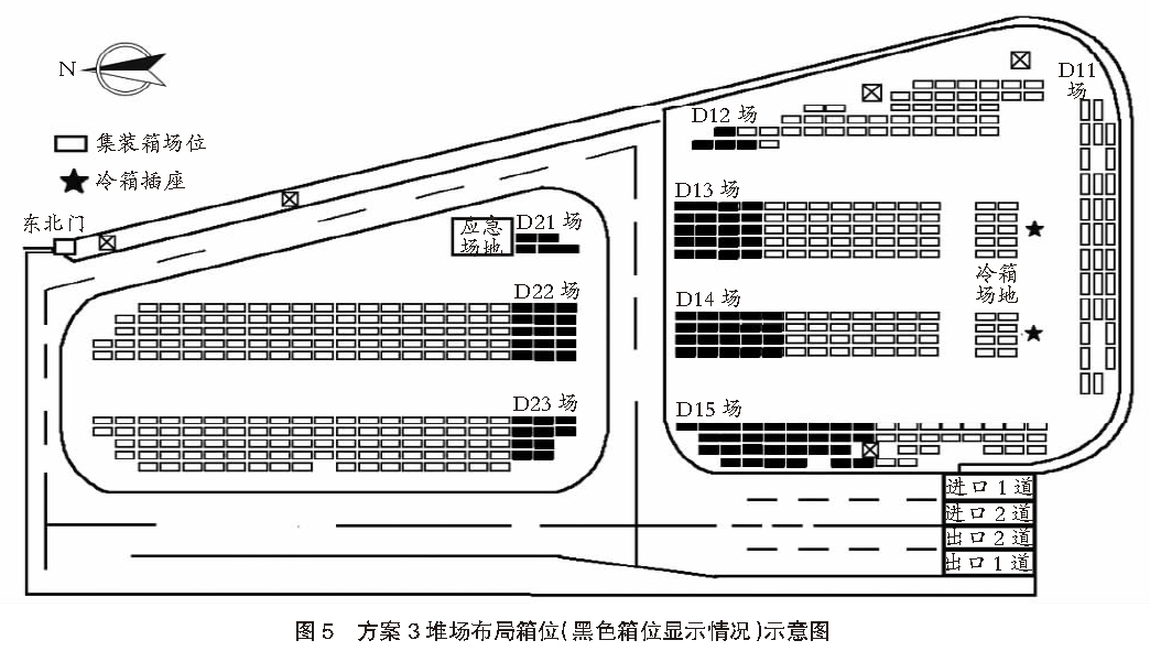 - 方案3:閃點(diǎn)≥29 ℃,總箱量不大于208 TEU。儲存區(qū)域?yàn)椋篋11不堆存;D12堆存8 TEU(由北至南1~2列位3個(gè)箱位,第3列西側(cè)箱位);D13堆存40 TEU(由北至南4列共20個(gè)箱位);D14堆存40 TEU(由北至南5列共20個(gè)箱位);D15堆存60 TEU(由北至南9列共30個(gè)箱位);D21~D23堆存60標(biāo)箱??傆?jì)共208 TEU。方案3堆場布局箱位(黑色箱位顯示情況)示意圖見圖5。