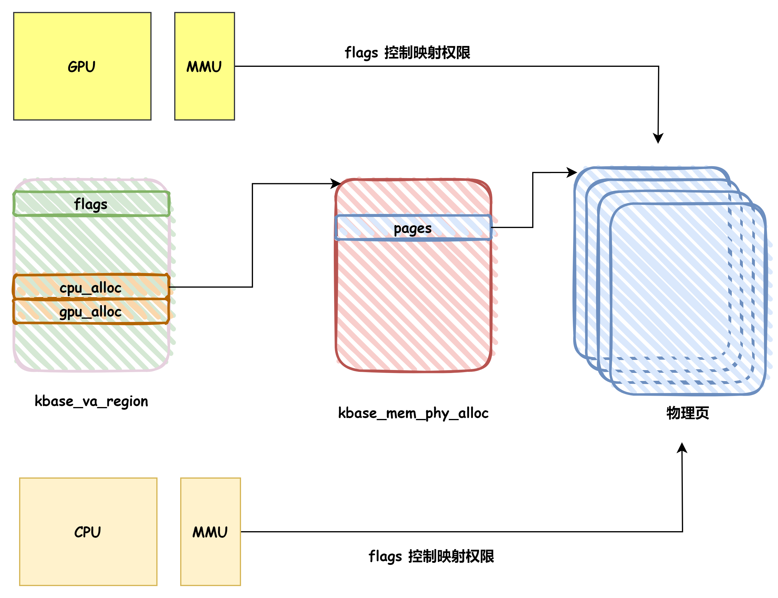 - kbase_va_region 中 cpu_alloc 和 gpu_alloc 指向 kbase_mem_phy_alloc ,表示該 reg 擁有的物理頁,且大部分場景下 cpu_alloc = gpu_alloc