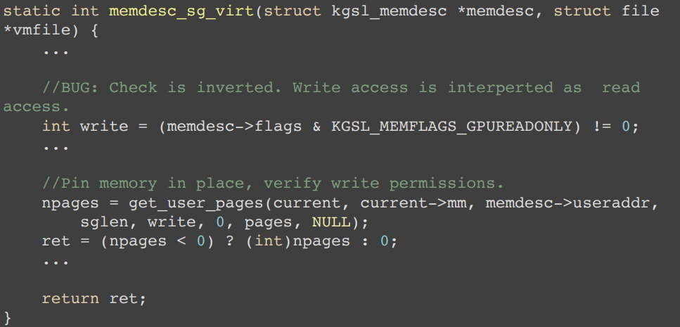 漏洞在于傳遞 get_user_pages 參數(shù)是只考慮了 KBASE_REG_GPU_WR 情況,沒有考慮 KBASE_REG_CPU_WR,當(dāng) reg->flags 為 KBASE_REG_CPU_WR 時 get_user_pages 的第三個參數(shù)為 0