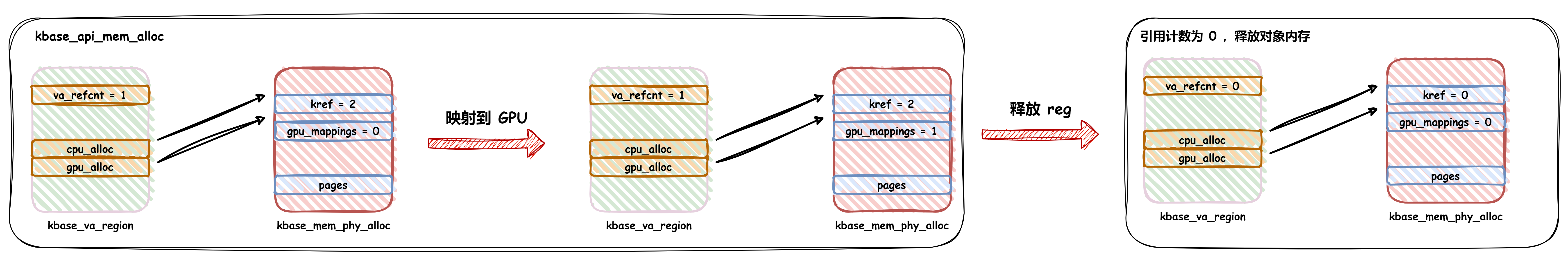 上圖表示的是 kbase_api_mem_alloc 創(chuàng)建非 SAME_VA 內(nèi)存的場景,kbase_gpu_mmap 執(zhí)行后會對 gpu_mappings 加一,然后通過 kbase_api_mem_free 釋放時,會將 kbase_va_region 和 kbase_mem_phy_alloc 的引用計(jì)數(shù)減成0,從而釋放兩個對象