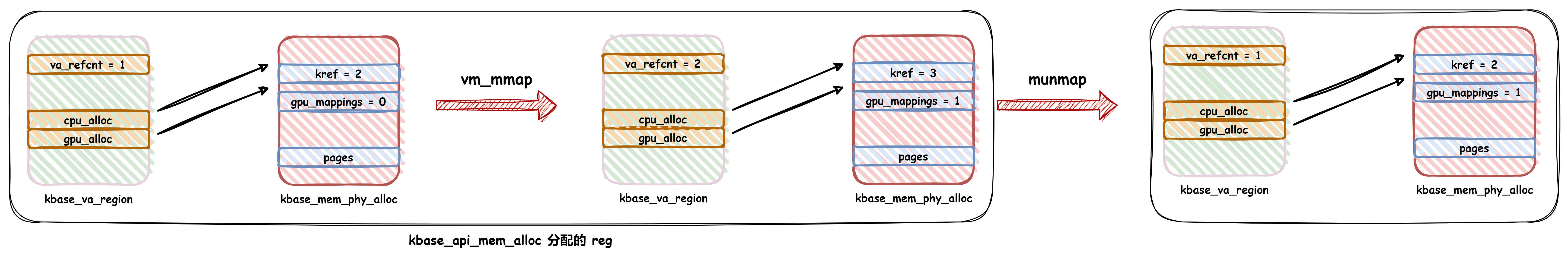 如果是 SAME_VA 的情況如下,區(qū)別在于 SAME_VA 內(nèi)存在 kbase_api_mem_alloc 中會調(diào)用 vm_mmap 把 reg 同時映射到 CPU 和 GPU 側(cè),這就需要增加對應(yīng)的引用計(jì)數(shù)(va_refcnt、kref、gpu_mappings),然后在 munmap 進(jìn)程 VA 時,減少對應(yīng)的引用計(jì)數(shù)