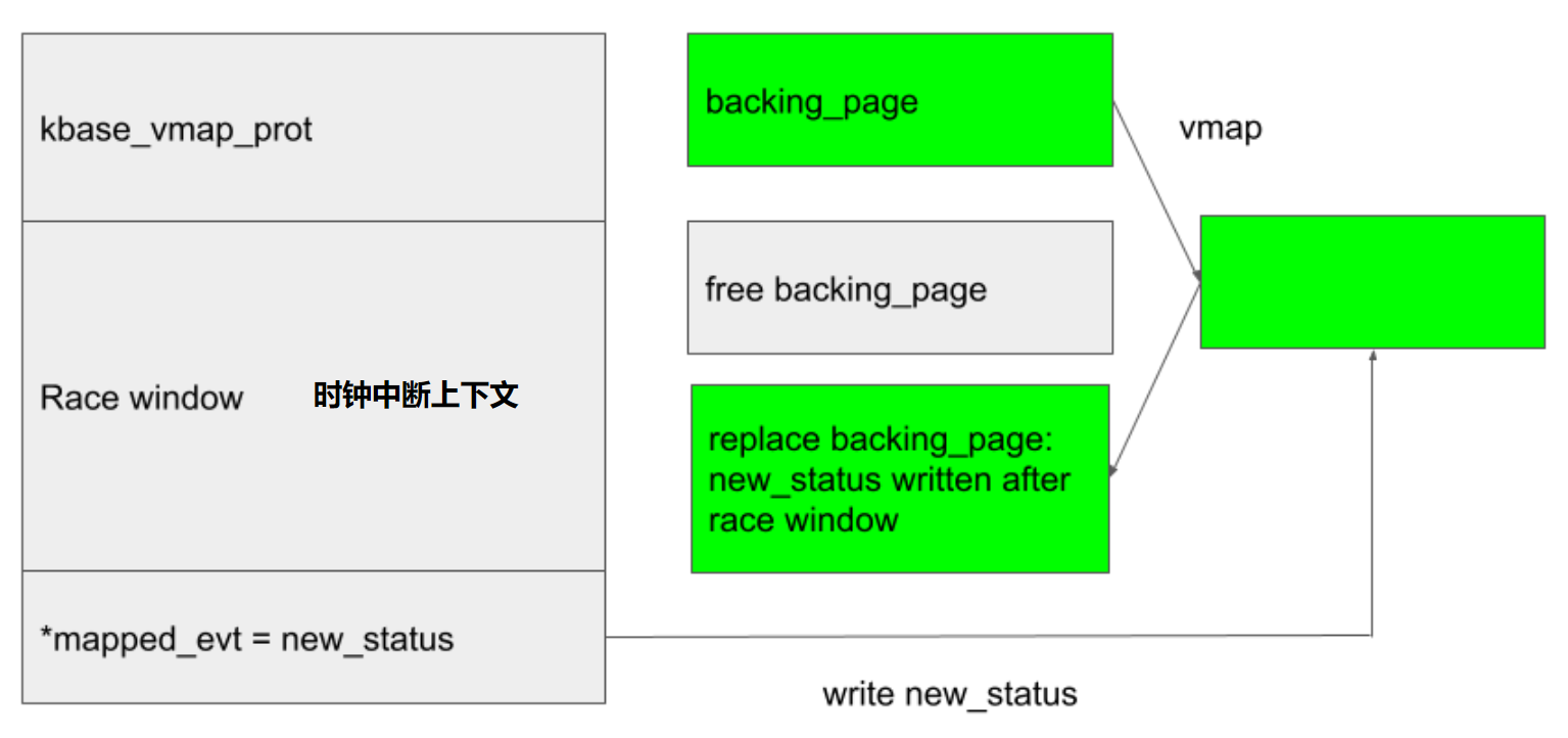 大致思路就是在 kbase_vmap_prot 和 *mapped_evt 之間出發(fā)時鐘中斷,從而擴(kuò)大時間窗,在兩步之間釋放 mapped_evt 對應(yīng)的物理頁,就能夠達(dá)到物理頁 UAF 的能力。