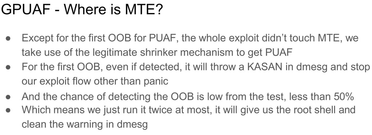 一個比較有意思的點(diǎn)是研究員發(fā)現(xiàn)及時安卓內(nèi)核啟用了 MTE,仍然有 50% 的概率能夠完成溢出而不被檢測,且及時 MTE 檢測到溢出,也不會導(dǎo)致內(nèi)核 Panic,只是殺掉用戶進(jìn)程,這樣就給了攻擊者無限嘗試的能力,相當(dāng)于 Bypass 了 MTE.