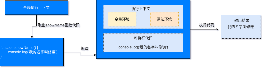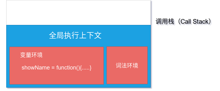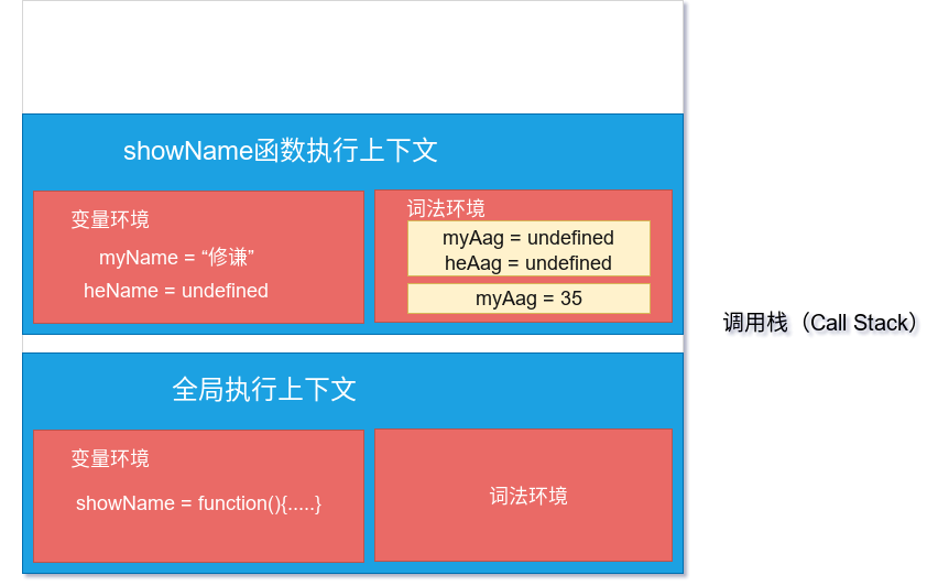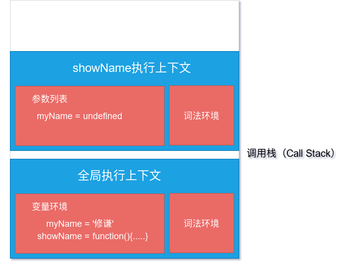 那既然在編譯階段就在內(nèi)存中固定了位置,為什么又會出現(xiàn)提升呢?編譯階段和變量提升存在什么關(guān)系呢?這里我們就不得不說到另外一個概念:執(zhí)行上下文(Execution context) 2、執(zhí)行上下文(Execution context)所謂執(zhí)行上下文,我們可以簡單的理解為就是 JavaScript 執(zhí)行一段代碼時的運(yùn)行環(huán)境,比如當(dāng)我們在JavaScript文件中調(diào)用一個函數(shù),那么就會進(jìn)入這個函數(shù)的執(zhí)行上下文,就會確定該函數(shù)在執(zhí)行期間用到的諸如 this、變量、對象以及函數(shù)等。并且在執(zhí)行上下文中還存在一個變量環(huán)境的對象(Viriable Environment),這是非常重要的。因?yàn)樵搶ο笾斜4媪俗兞刻嵘膬?nèi)容,比如上面代碼中的變量myName和函數(shù)showName,都會保存在該對象中(我們先用下面的這段代碼模擬一下,后面在詳細(xì)講解)。 1 ViriableEnvironment(變量環(huán)境) 2 myName -> undefined 3 showName -> function: {console.log(myName)} 在JavaScript中,執(zhí)行上下文一般分為以下三種: 1、全局執(zhí)行上下文:當(dāng) JavaScript 執(zhí)行全局代碼的時候,會編譯全局代碼并創(chuàng)建全局執(zhí)行上下文,而且在整個頁面的生存周期內(nèi),全局執(zhí)行上下文只有一份。 2、函數(shù)執(zhí)行上下文:當(dāng)調(diào)用一個函數(shù)的時候,函數(shù)體內(nèi)的代碼會被編譯,并創(chuàng)建函數(shù)執(zhí)行上下文,在一般情況下,函數(shù)執(zhí)行結(jié)束之后,創(chuàng)建的函數(shù)執(zhí)行上下文會被銷毀。 3、eval :當(dāng)使用 eval 函數(shù)的時候,eval 的代碼也會被編譯,并創(chuàng)建執(zhí)行上下文。 但是我們現(xiàn)在常接觸或者說的一般都是指前面兩者。了解完執(zhí)行上下文的概念和分類后,我們再來了解一下另外的兩個知識點(diǎn):函數(shù)執(zhí)行(調(diào)用)和棧 3、函數(shù)執(zhí)行(調(diào)用)函數(shù)調(diào)用概念很簡單,簡單一點(diǎn)來說就是運(yùn)行一個函數(shù),具體使用方式是使用函數(shù)名稱跟著一對小括號。我們舉個例子來說一下 1 var myName = '修謙' 2 function showName() { 3 console.log('我的名字叫修謙') 4 } 5 6 showName() // 執(zhí)行 這段代碼很簡單。首先我們創(chuàng)建了一個名叫myName的變量,接著又創(chuàng)建了一個showName的函數(shù)。完后緊接著在最后面調(diào)用執(zhí)行了該方法。下面我們就以這段簡單的代碼來說一下函數(shù)調(diào)用的過程。 當(dāng)執(zhí)行到函數(shù)showName()之前,JavaScript 引擎會為上面這段代碼創(chuàng)建全局執(zhí)行上下文,包含聲明的函數(shù)和變量,如下圖所示:
