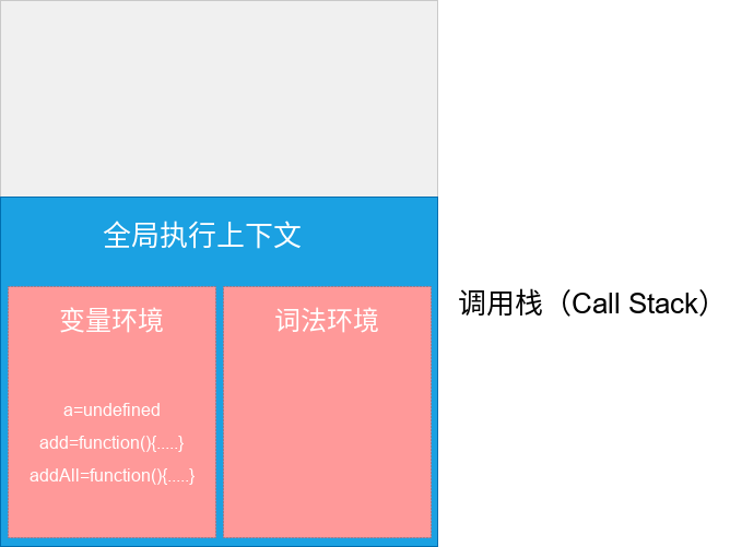 4、執(zhí)行上下文棧(JavaScript調(diào)用棧)下面我們就來具體的用代碼和圖來模擬JS執(zhí)行上下文棧是如何執(zhí)行代碼的,如下面一段代碼(以ES5來演示) 1 var a = 2 2 function add(b,c){ 3 return b+c 4 } 5 function addAll(b,c){ 6 var d = 2 7 result = add(b,c) 8 return a+result+d 9 } 10 addAll(3,3) 第一步:創(chuàng)建全局上下,并將其壓入棧底(如圖所示)此時變量a、函數(shù)add 以及 addAll 都保存到了全局上下文的變量環(huán)境對象中。