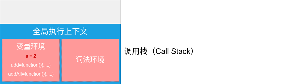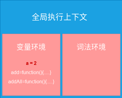 當(dāng)全局執(zhí)行上下文壓入到調(diào)用棧后,緊接著,JavaScript引擎便開始執(zhí)行全局代碼了。首先會執(zhí)行a=2的賦值操作,賦值完后,此前a的值就從undefined變成了2。因?yàn)榇藭r的add函數(shù)和addAll函數(shù)都還沒有執(zhí)行,因此狀態(tài)還是之前的。這一步完成后,我們再來看全局上下文的狀態(tài),如下圖所示: