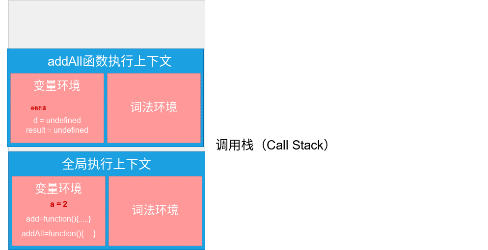 第二步:執(zhí)行addAll函數(shù),此時JavaScript引擎會編譯該函數(shù),并為其創(chuàng)建一個執(zhí)行上下文,然后將其執(zhí)行上下文壓入棧中,如圖所示: