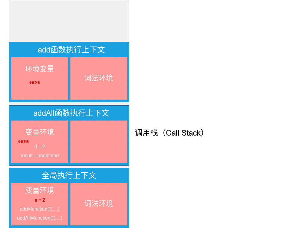 同樣的,當(dāng)addAll函數(shù)的執(zhí)行上下文創(chuàng)建好之后,就會進(jìn)入了函數(shù)代碼的執(zhí)行階段了,因?yàn)楹瘮?shù)中有一個變量d,因此還是先執(zhí)行賦值操作,即將d的值從之前的d=undefined設(shè)置成d=10 。然后接著往下執(zhí)行。 第三步:執(zhí)行add函數(shù),當(dāng)執(zhí)行到add函數(shù)調(diào)用語句時,JavaScript引擎同樣又會為其創(chuàng)建執(zhí)行上下文,并將其壓入調(diào)用棧,此時的調(diào)用棧的狀態(tài)如下圖所示:
