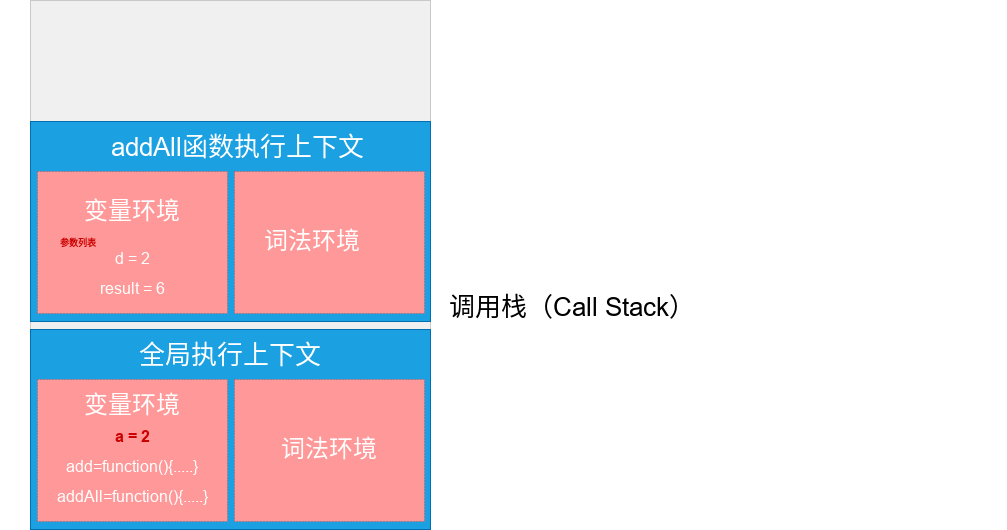 當(dāng)函數(shù)內(nèi)部作用域塊執(zhí)行結(jié)束之后,其內(nèi)部定義的變量就會從詞法環(huán)境的棧頂彈出,最終的執(zhí)行上下文如下圖所示: