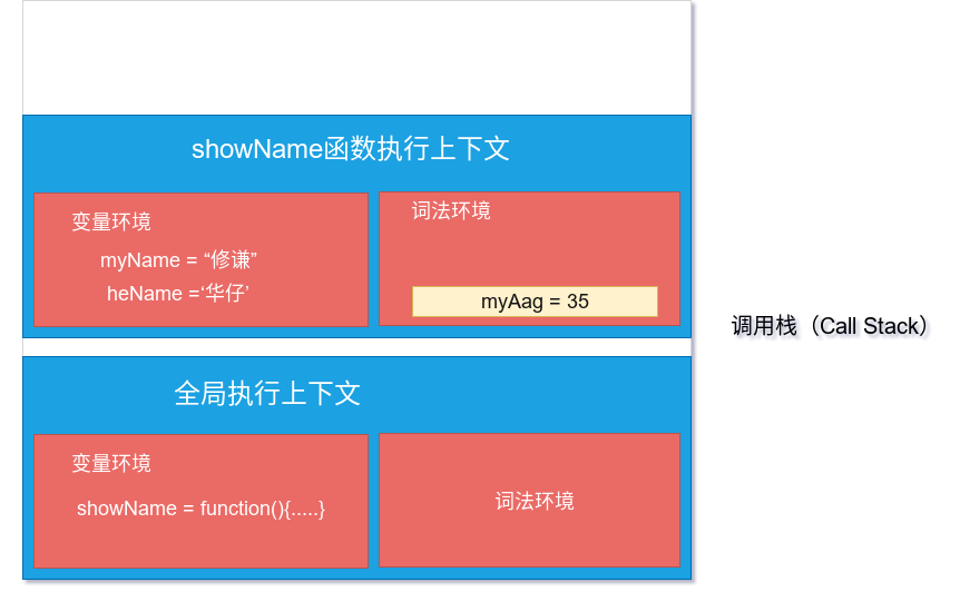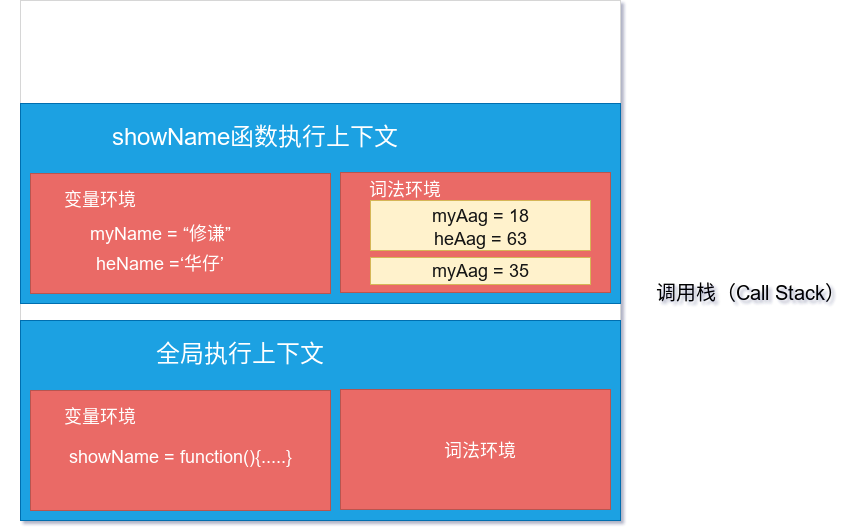 第三步:繼續(xù)往下執(zhí)行代碼。當(dāng)執(zhí)行到代碼塊里面時,變量環(huán)境中myName的值已經(jīng)被設(shè)置成了"修謙",而詞法環(huán)境中myAag的值則被設(shè)置成了35,此時的函數(shù)的執(zhí)行上下文如下圖所示: