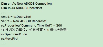 如果遇到查詢超時(shí)的錯(cuò)誤,我們可以在程序中修改 Recordset 對(duì)象的超時(shí)設(shè)置,再打開結(jié)果集。例如: