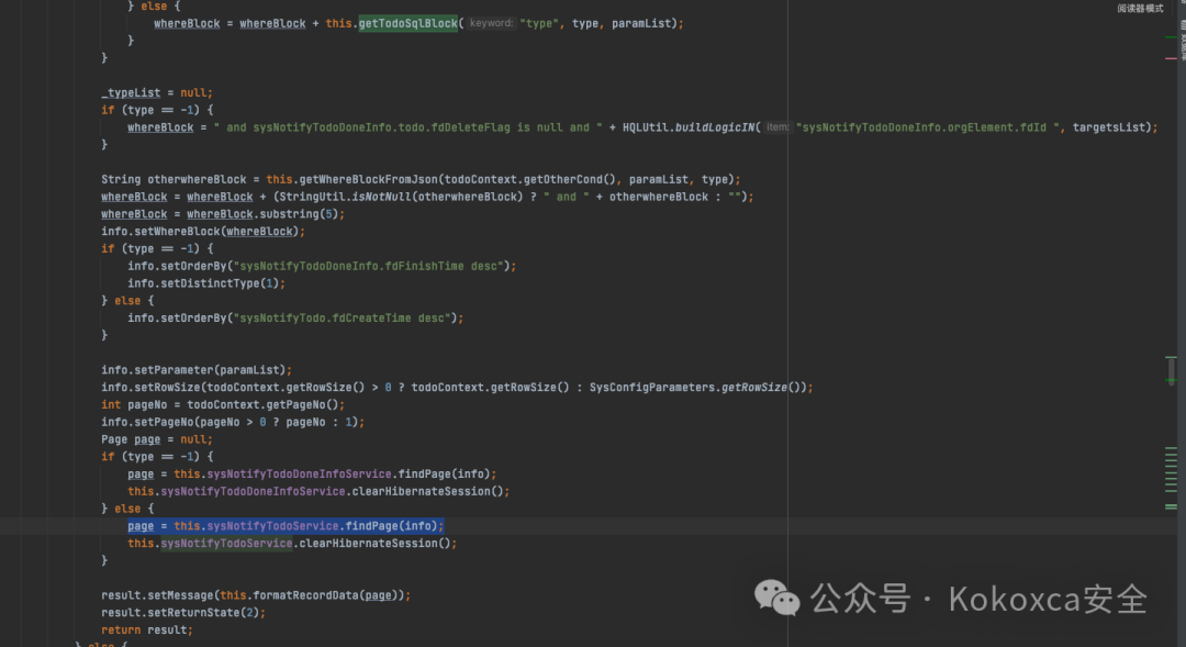 剩余的不重要直接跳到重點(diǎn),根據(jù)前面的代碼可以判斷出如果type不是13執(zhí)行以下代碼。whereBlock = whereBlock + this.getTodoSqlBlock("type", type, paramList);調(diào)用getTodoSqlBlock方法,傳入"type"、type和paramList,向whereBlock 添加對應(yīng)的 SQL 查詢條件。