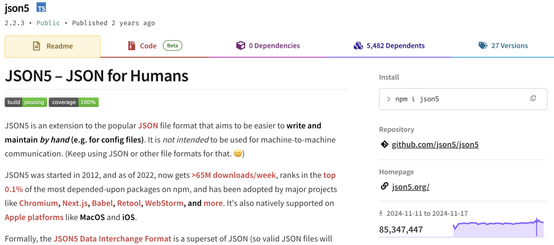 JSON5 項(xiàng)目始于 2012 年。截至 2024 年,JSON5 每周下載量超過 8500 萬次,是 npm 上最受依賴的 0.1% 軟件包之一,并被廣泛應(yīng)用于主流項(xiàng)目如 Chromium、Next.js、Babel、Retool、WebStorm 等。此外,JSON5 還原生支持 MacOS 和 iOS 等蘋果平臺。
