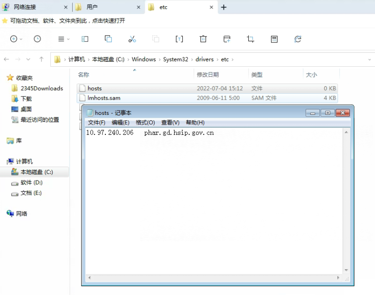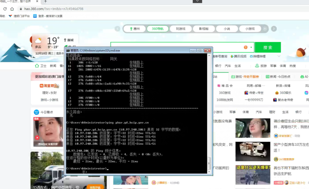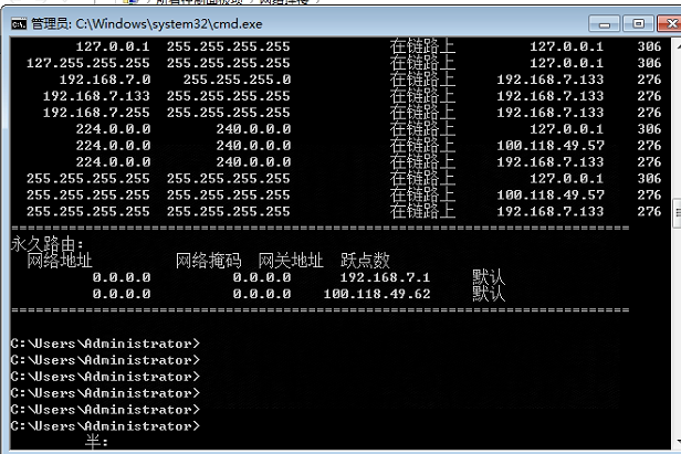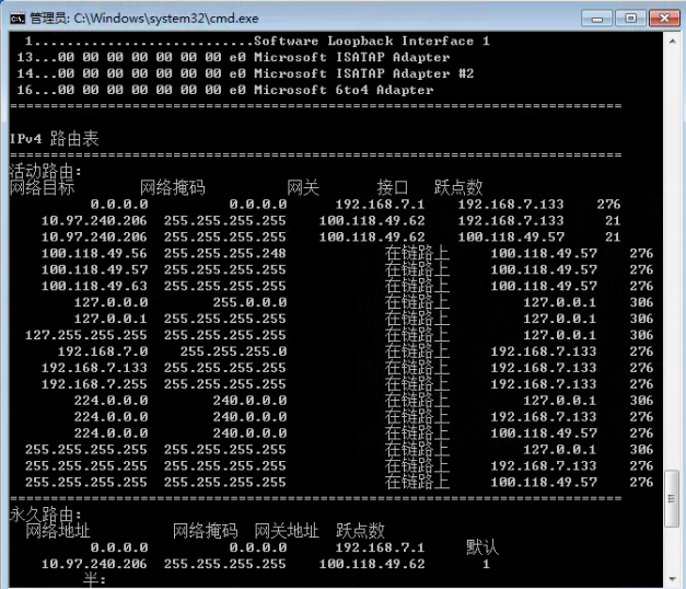 可以看到,如果電腦配置成功之后,可以直接訪問到集團的10.97.240.206,域名是phar.gd.hsip.gov.cn,可以看到這個域名解析出來的IP地址就是10.97.240.206。 我們再使用route print 可以看到兩個目標網(wǎng)絡(luò),都是默認路由器,躍點數(shù)也都是一樣的。