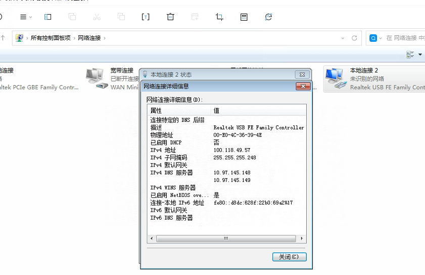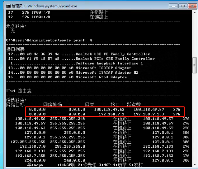 可以看到當我們在配置完靜態(tài)路由之后,可以看到,本地連接2的USB網(wǎng)卡中的默認網(wǎng)關(guān)是沒有被填寫的,但其實這個USB網(wǎng)卡是有網(wǎng)關(guān)的,已經(jīng)通過剛才上面的靜態(tài)路由器添加到系統(tǒng)里面了,只是這個里沒有顯示而已。