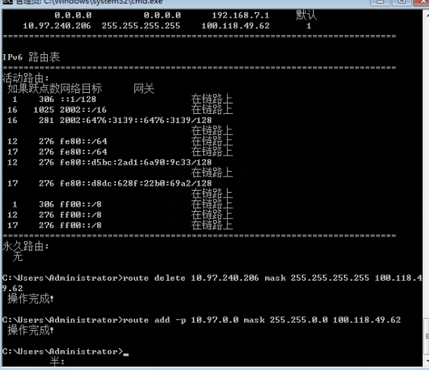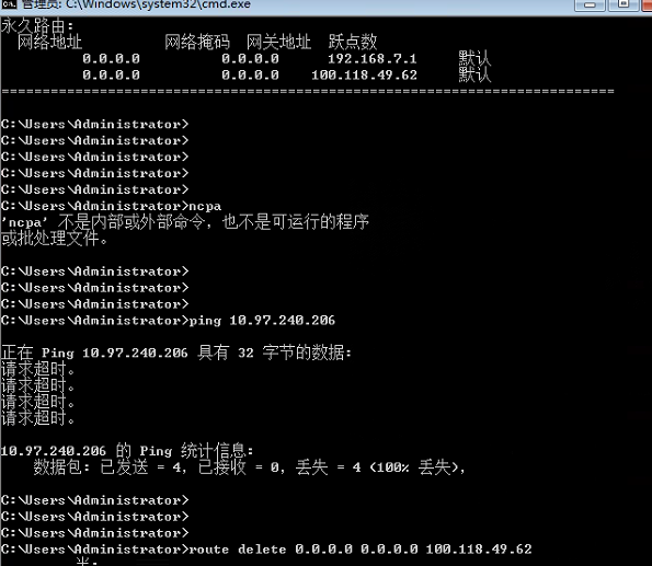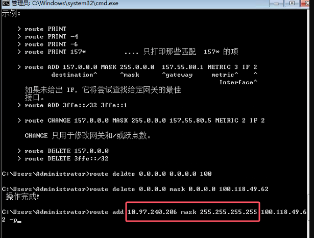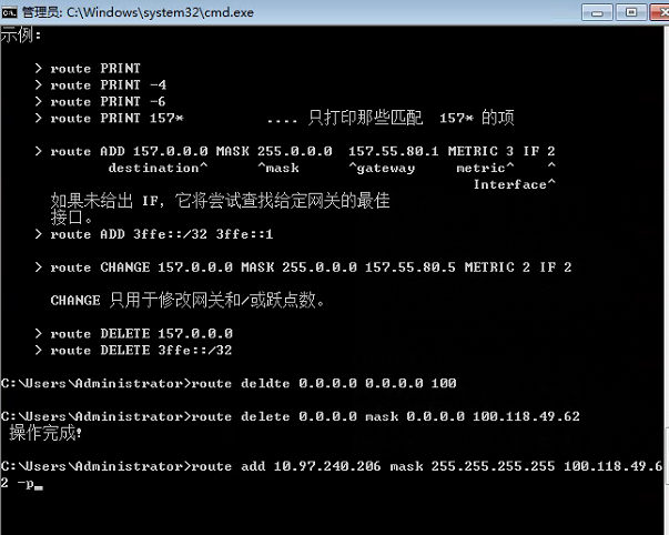 刪除完成之后,我們再添加一條單獨主機的靜態(tài)路由。 route add 10.97.240.206 mask 255.255.255.255 100.118.49.62 -p 這條是什么意思呢?就是說,我添加一條靜態(tài)路由,去訪問10.97.240.206這臺web服務(wù)器,只要電腦的流量是去訪問10.97.240.206這個Ip地址的,那流量都轉(zhuǎn)100.118.49.62這個網(wǎng)關(guān)上轉(zhuǎn)發(fā)。-p的意思就是這條靜態(tài)路由器是需要永久配置到這臺電腦上的,如果不加-p,那么電腦重啟之后,這條靜態(tài)路由會自動被刪除的。