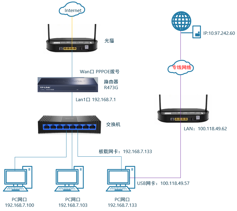 本地連接是默認的連接外網(wǎng)。本地連接2,是一個USB網(wǎng)卡,連接的是集團在這邊辦理的光貓。