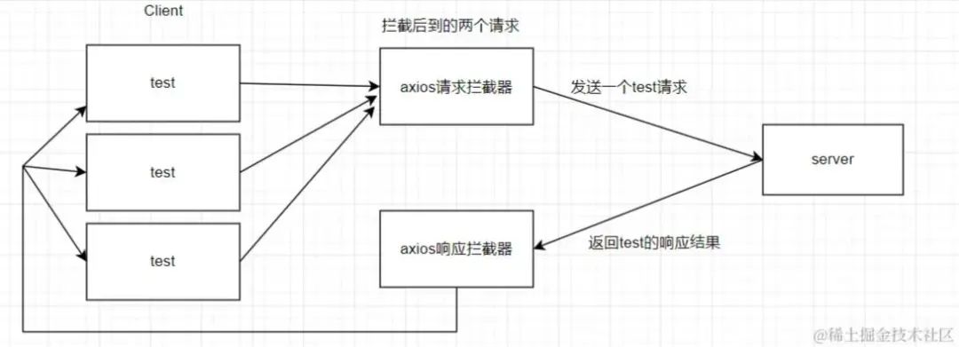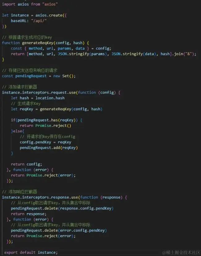 有了請(qǐng)求的key,我們就可以在請(qǐng)求攔截器中把每次發(fā)起的請(qǐng)求給收集起來(lái),后續(xù)如果有相同請(qǐng)求進(jìn)來(lái),那都去這個(gè)集合中去比對(duì),如果已經(jīng)存在了,說(shuō)明就是一個(gè)重復(fù)的請(qǐng)求,我們就給攔截掉。 當(dāng)請(qǐng)求完成響應(yīng)后,再將這個(gè)請(qǐng)求從集合中移除。合理,nice! 具體實(shí)現(xiàn)如下: