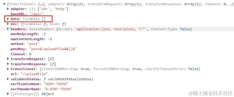 可以看到,我在這里是上傳了兩個(gè)不同的文件的,但只調(diào)用了一次上傳接口。按理說(shuō)是兩個(gè)不同的請(qǐng)求,可為什么會(huì)被我們前面寫的邏輯給攔截掉一個(gè)呢? 我們打印一下請(qǐng)求的config: